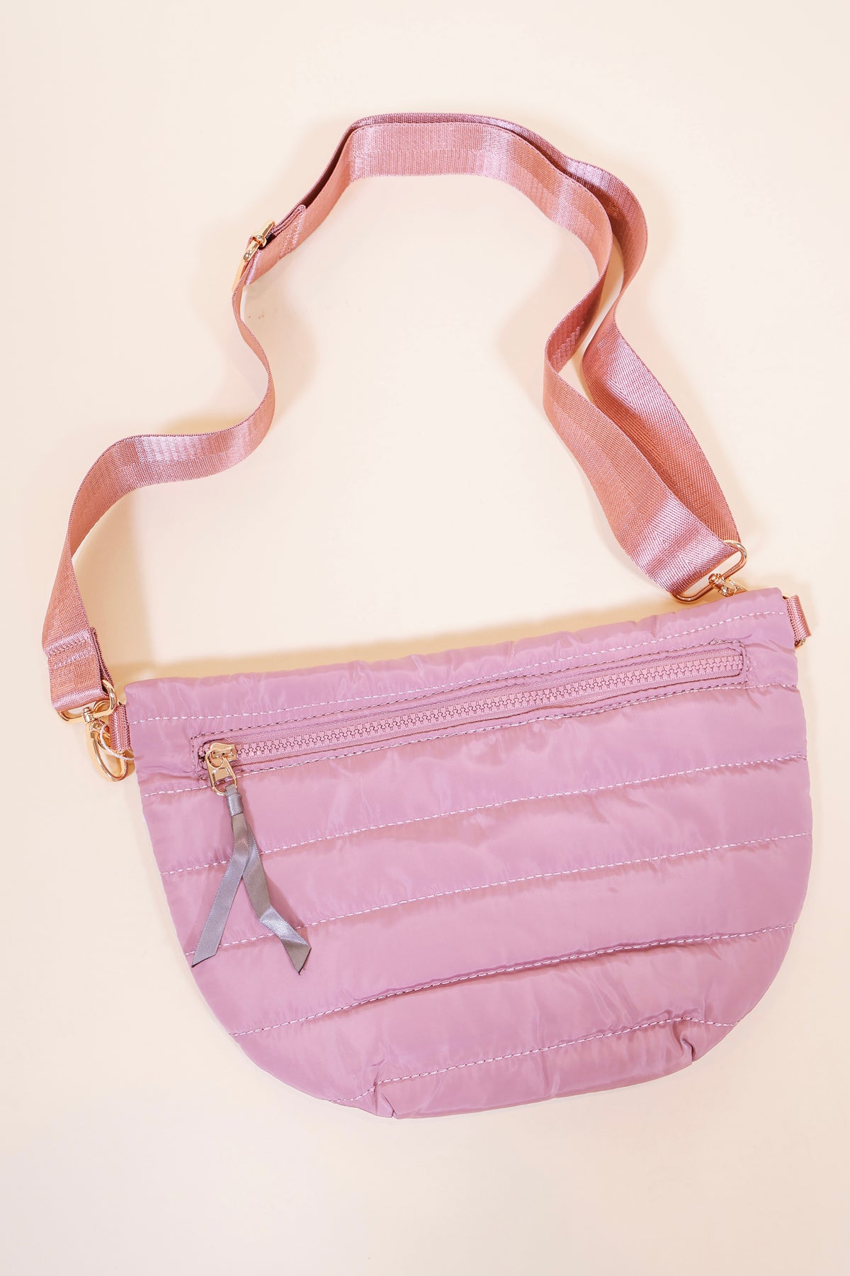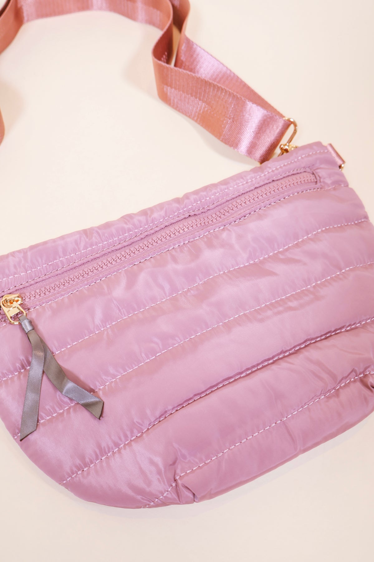 The Jolie Puffer Belt Bag is a chic update on the classic fanny pack. Designed with versatility in mind, this bag can be worn three ways: as a belt bag, crossbody, or shoulder bag. Its playful half-moon shape is paired with a shiny canvas strap, gold hardware, and a ribbon accent that adds the perfect pop of color.