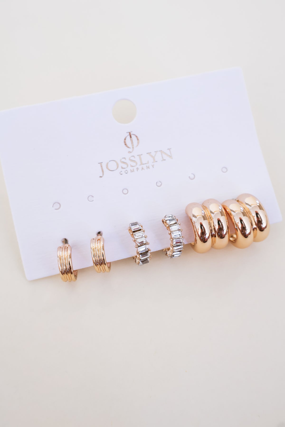 Baguette Stone Double Hoop Huggie Trio Earrings - Gold