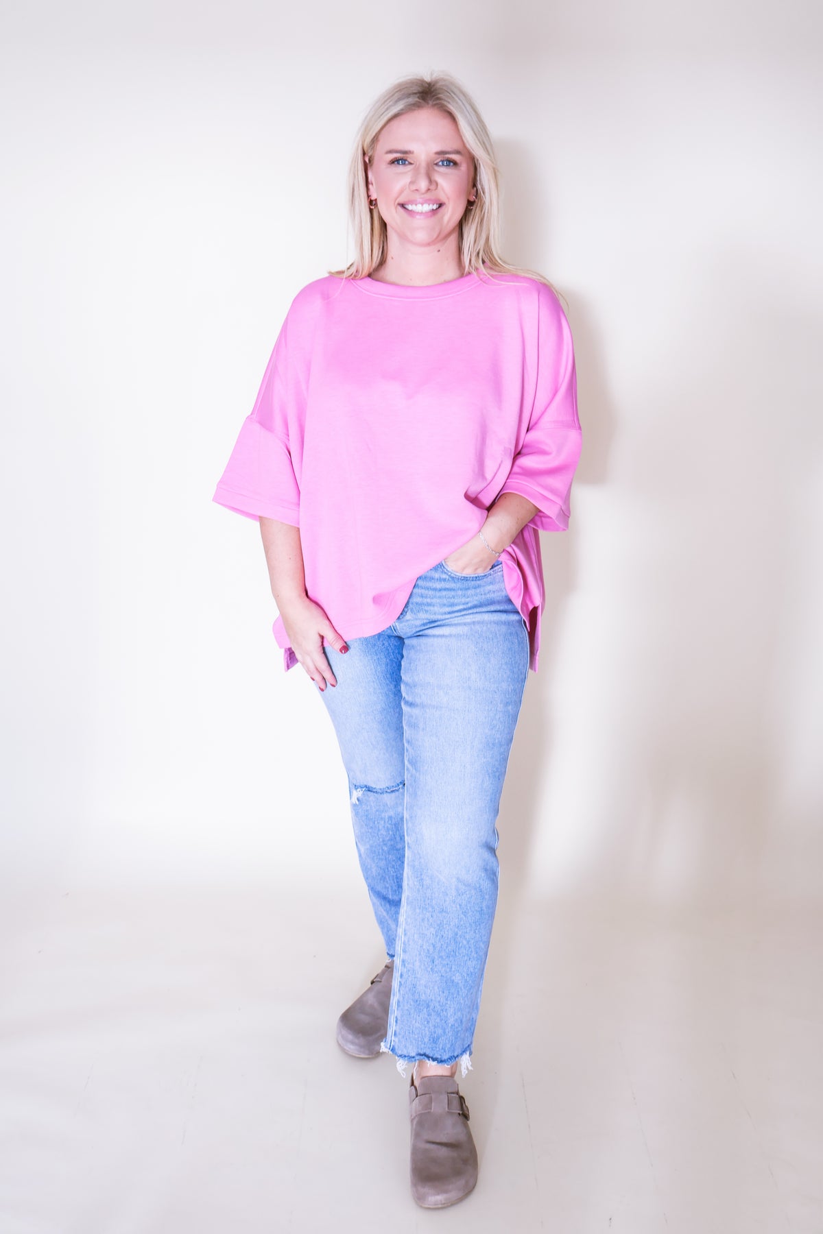 Scuba Round Neck Top with Side Slits - Candy Pink