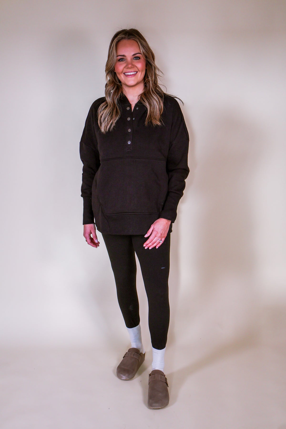 Fleece Half-Snap Button Hooded Sweatshirt - Black