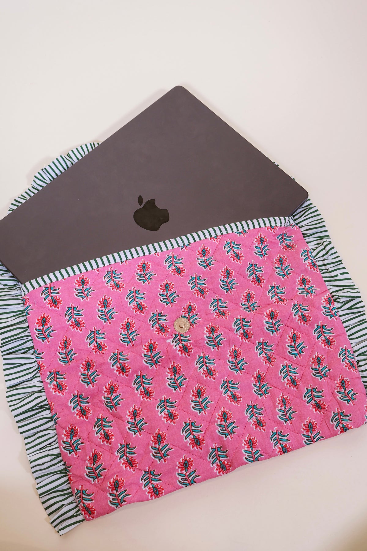 Carry your tech in style with this charming floral sleeve. Designed in a pink and green floral fabric with a sweet bow accent, it blends functionality with a touch of feminine flair. Soft yet durable, it protects your device while looking chic on the go. Fits most tablets and laptops up to 19".