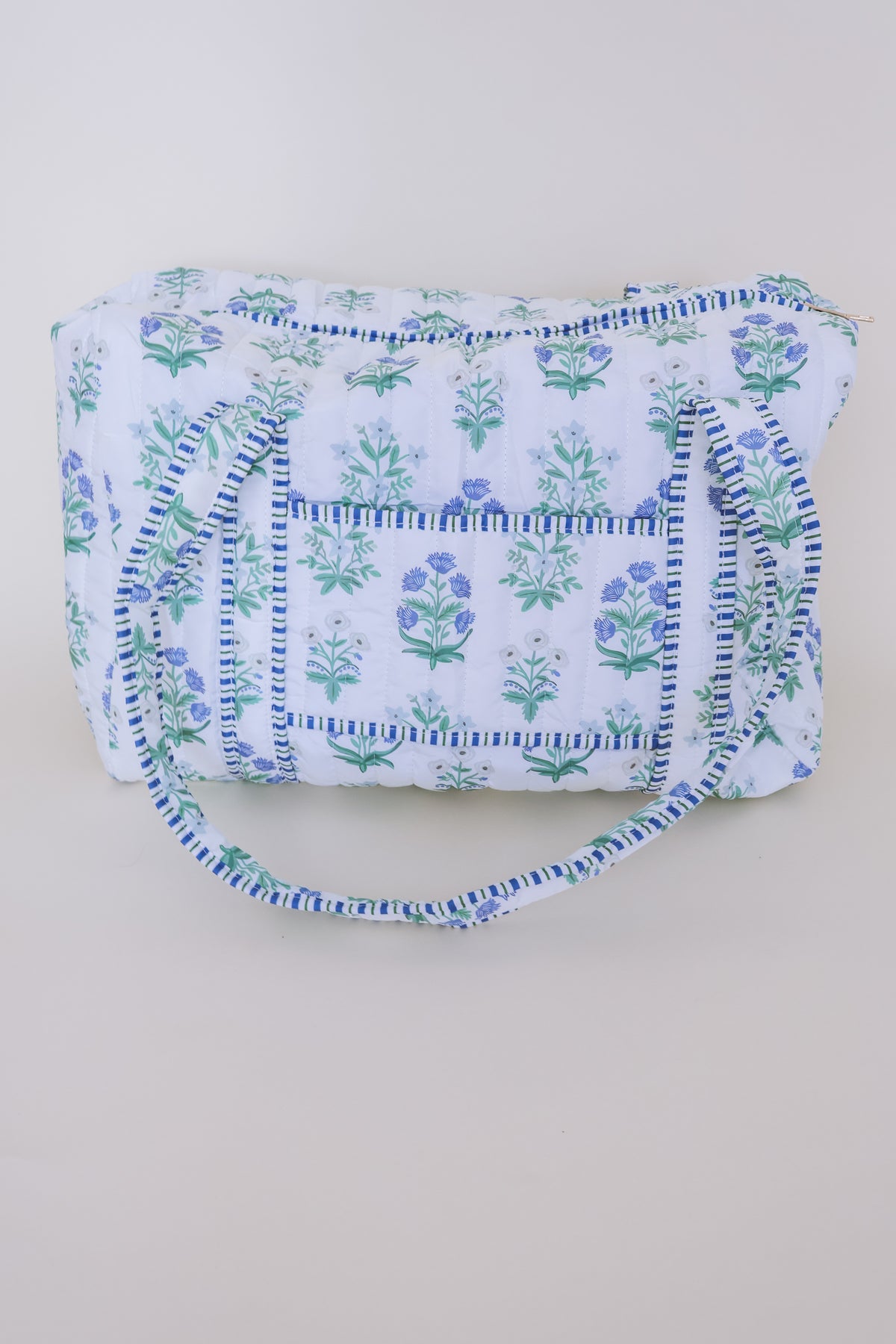Our Cotton Quilted Weekender Bag in a boho floral hand block print is the perfect blend of function and charm. Crafted from soft, lightweight quilted cotton, it’s roomy enough for all your travel essentials while still feeling cozy and chic. Whether you’re heading out for a weekend getaway, girls’ trip, or overnight stay, this bag keeps you organized and on-trend.