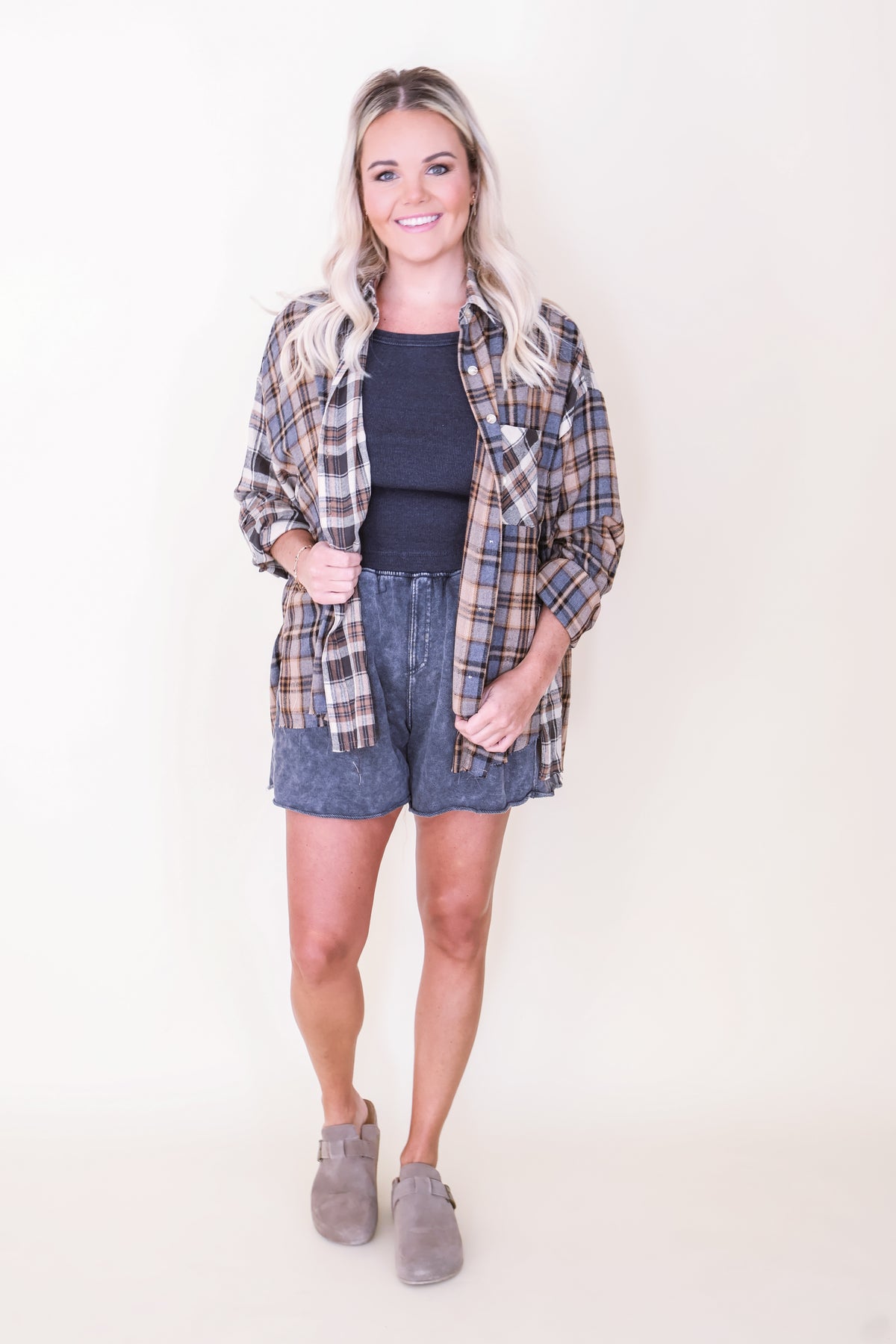 SHORTS - Mineral-washed French terry shorts featuring a soft, lived-in feel, an elastic waistband, and side pockets for everyday comfort and style. Perfect for lounging or casual outings. Features: - Mineral washed French terry fabric - Relaxed fit - High rise / High waist - Mid-thigh length - Exposed seam details - Elastic waistband - Side pockets Model is 5'8" and wearing size Small.