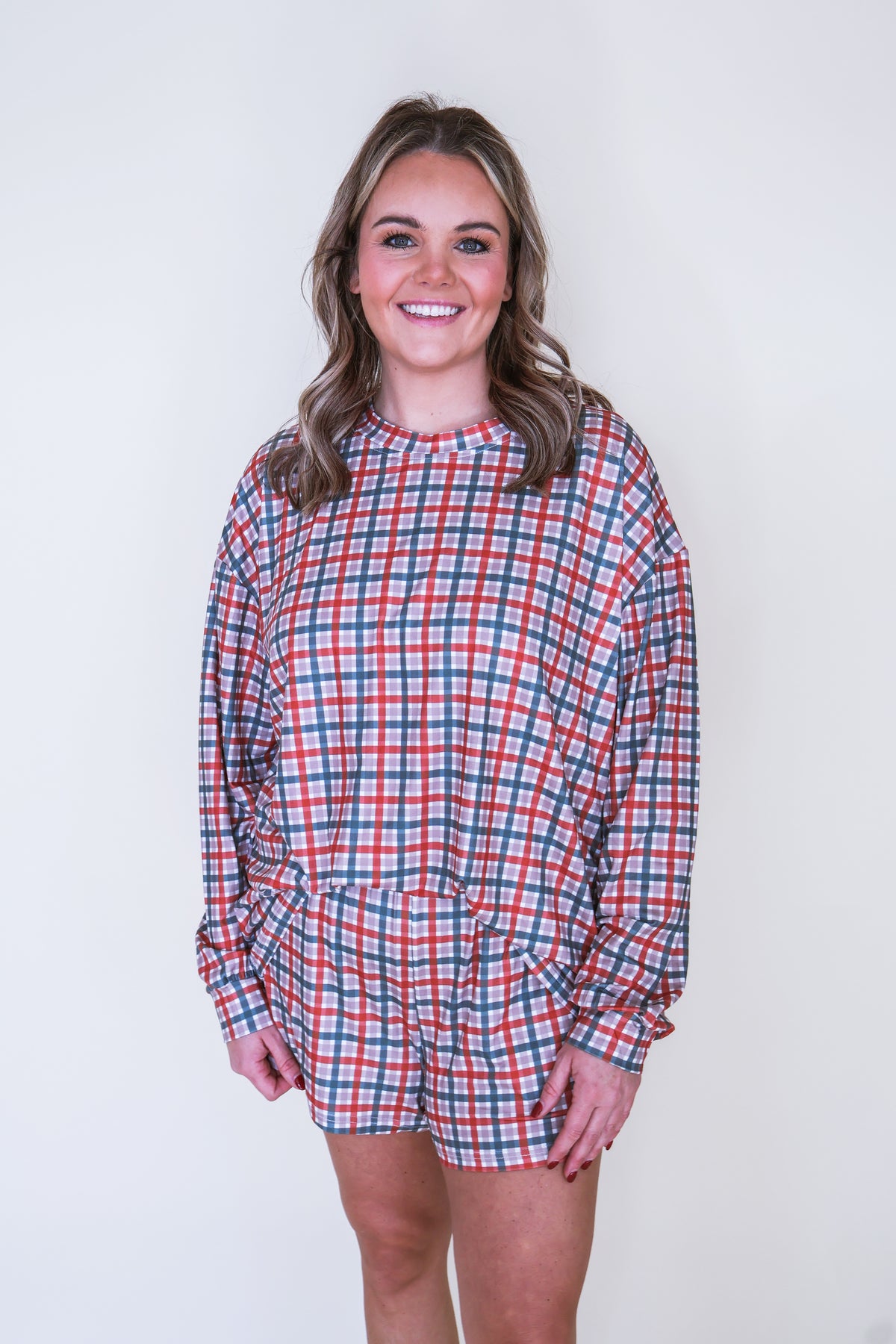 The perfect holiday set has arrived, and we’re obsessed! This cozy-chic duo features a relaxed-fit top and the cutest boxer-style lounge shorts — made for cozy nights in, movie marathons, or gifting to your favorite bestie. Paired together, it’s a total vibe, but we also love mixing and matching — wear the top with leggings or denim for an effortlessly cute everyday look!