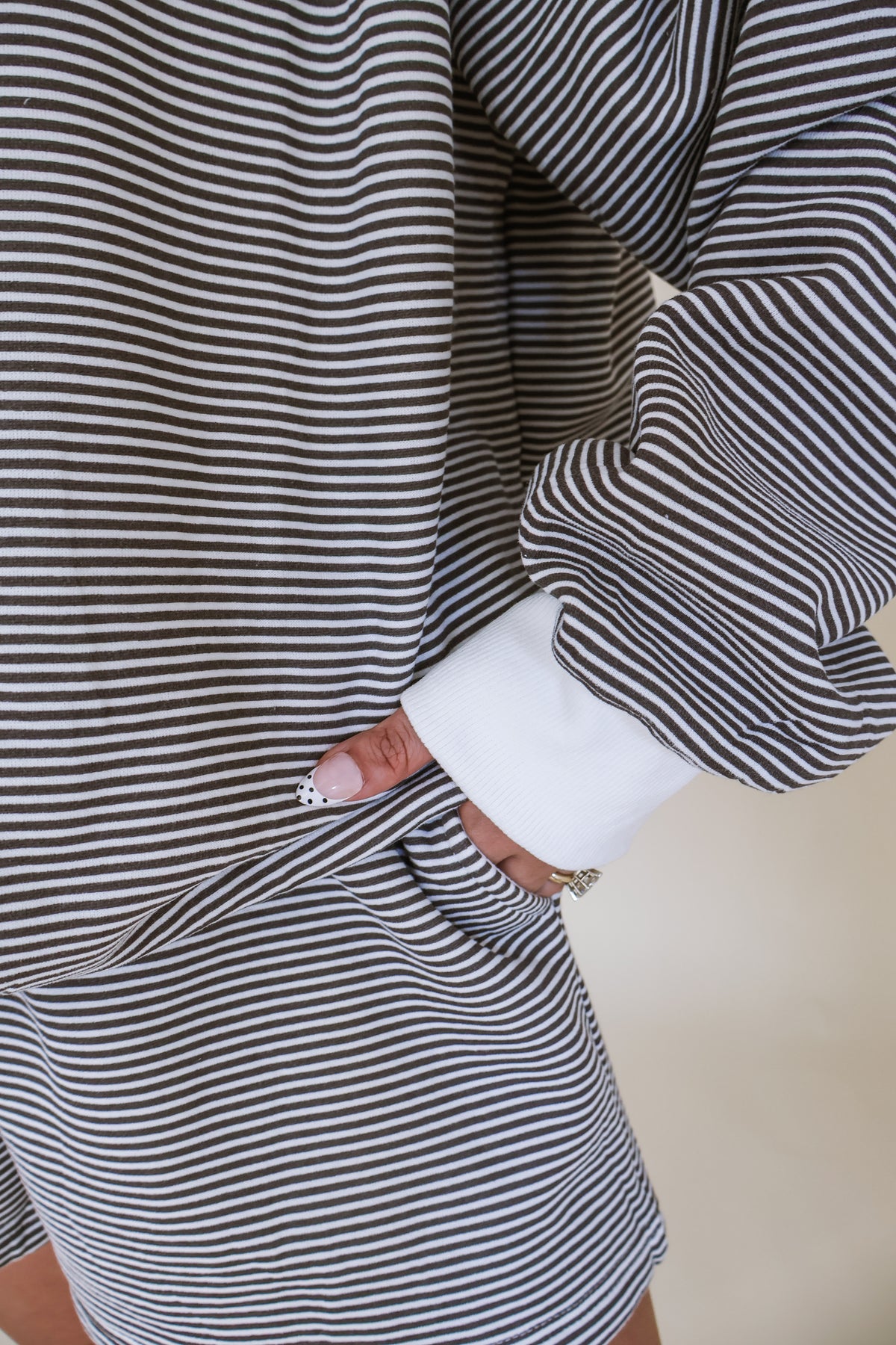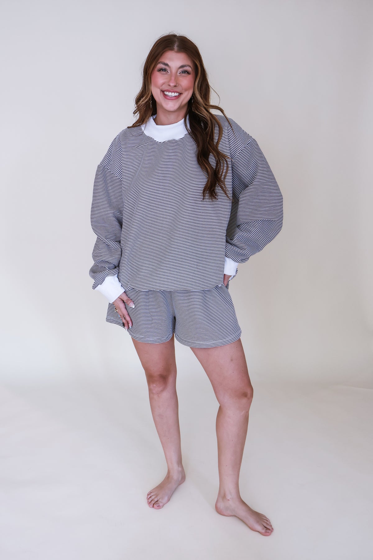 Featuring a relaxed-fit sweatshirt paired with matching shorts, this set is made for throwing on and looking put together without even trying. The classic stripe pattern gives it that timeless, elevated feel while still being fun and easy to wear.