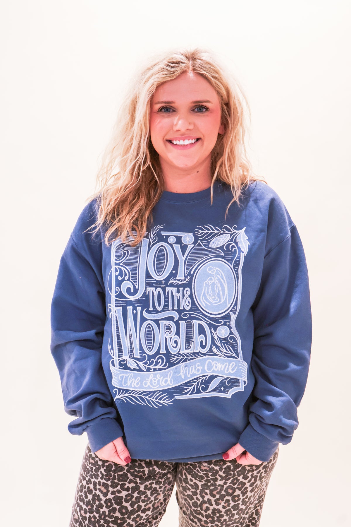Celebrate the season in cozy style with our Joy to the World sweatshirt! Crafted on a soft Jerzees fleece in a rich denim blue shade, this sweatshirt features a festive holiday graphic that spreads warmth and cheer wherever you go. Perfect for everyday wear, Christmas gatherings, or lounging fireside with a cup of cocoa.