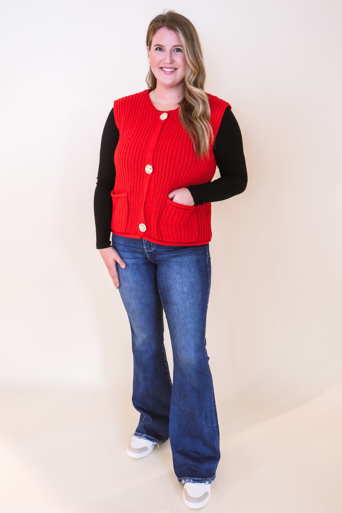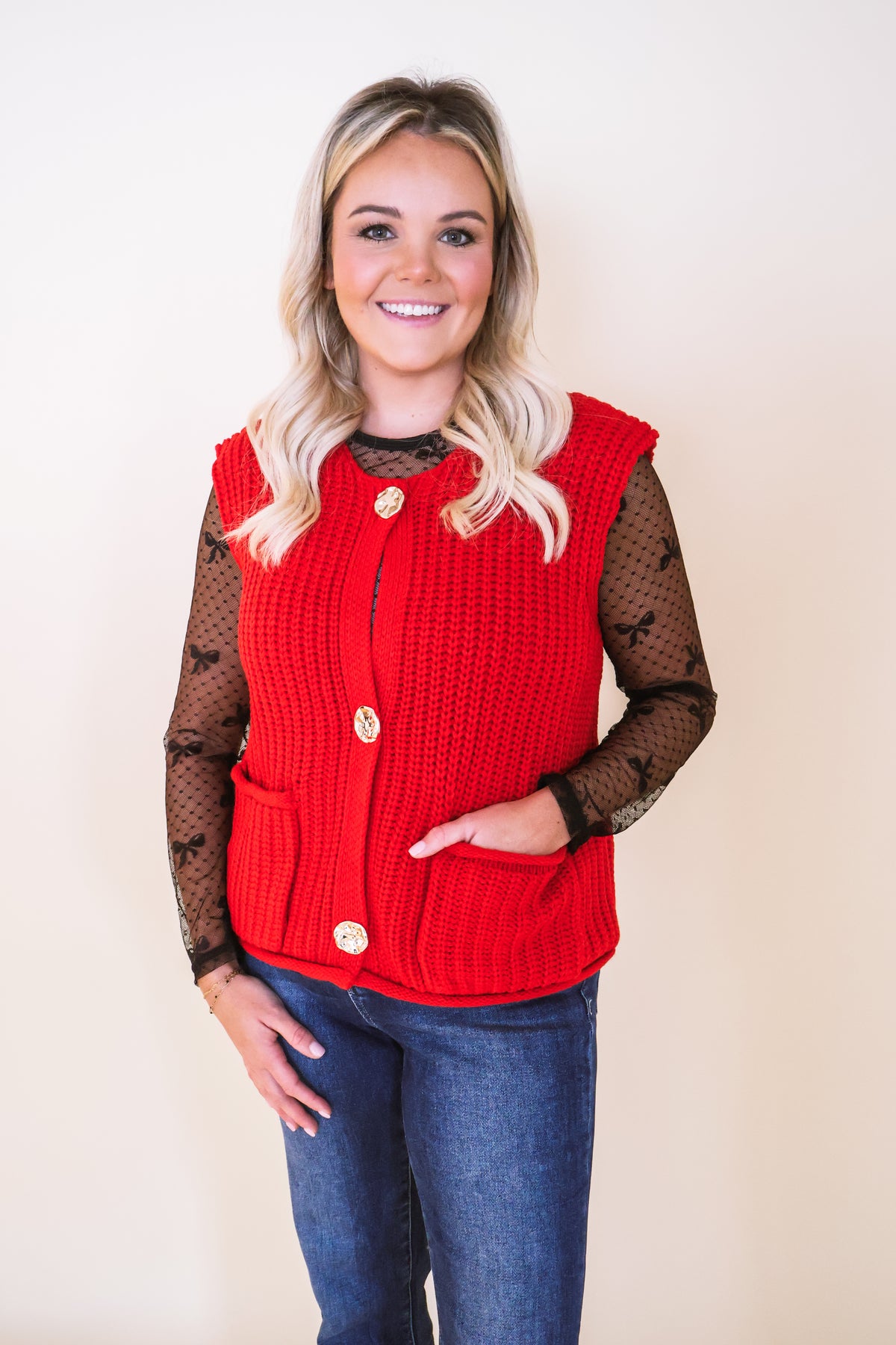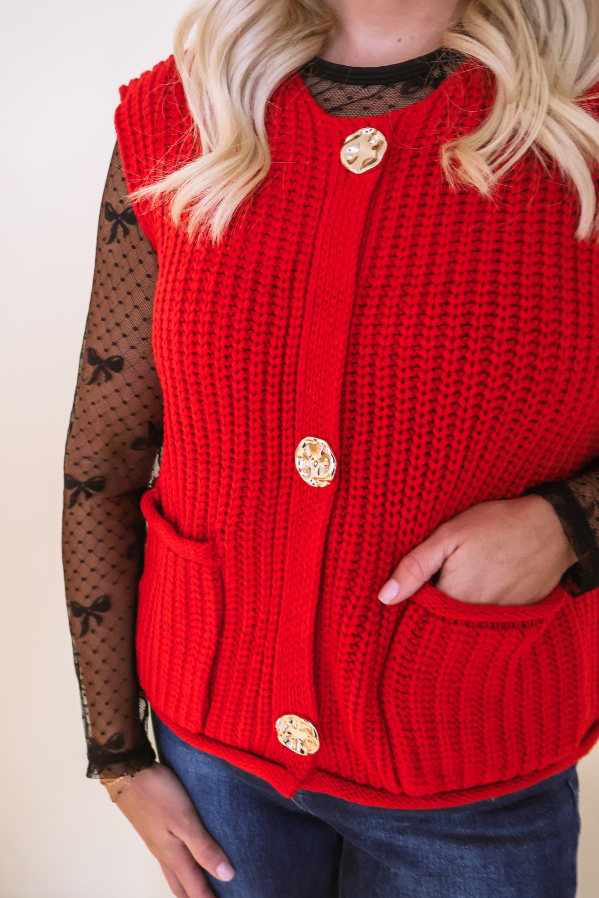 Add a touch of luxe to your layering game with this chunky knit sweater vest. Featuring eye-catching gold button details, this piece combines classic charm with modern edge. The textured knit gives it a cozy feel, while the sleeveless design makes it perfect for pairing over a mesh top, blouse, or fitted long sleeve.