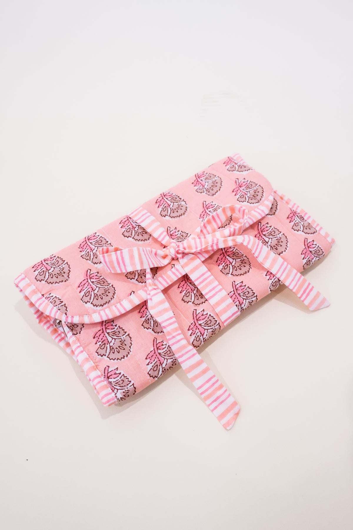 Compact yet roomy, the 9″ x 13″ Layla Jewelry Roll is ideal for packing in a suitcase, handbag, or overnight bag. With thoughtful detailing and a soft quilted finish, it makes a perfect gift for bridesmaids, travelers, or anyone who loves chic organization.